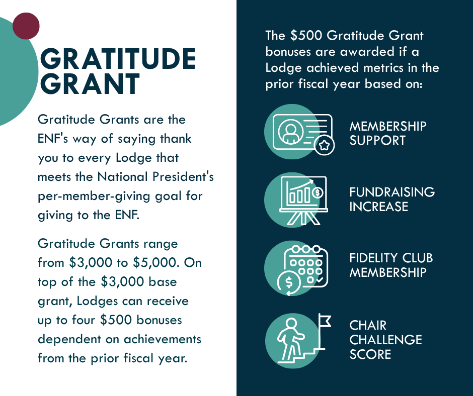 Since the Gratitude Grant was always meant to thank Lodges that met the National President’s per-member-giving goal, bonuses to the Gratitude Grant were introduced in 2015 to reward Lodges for achieving additional fundraising benchmarks.